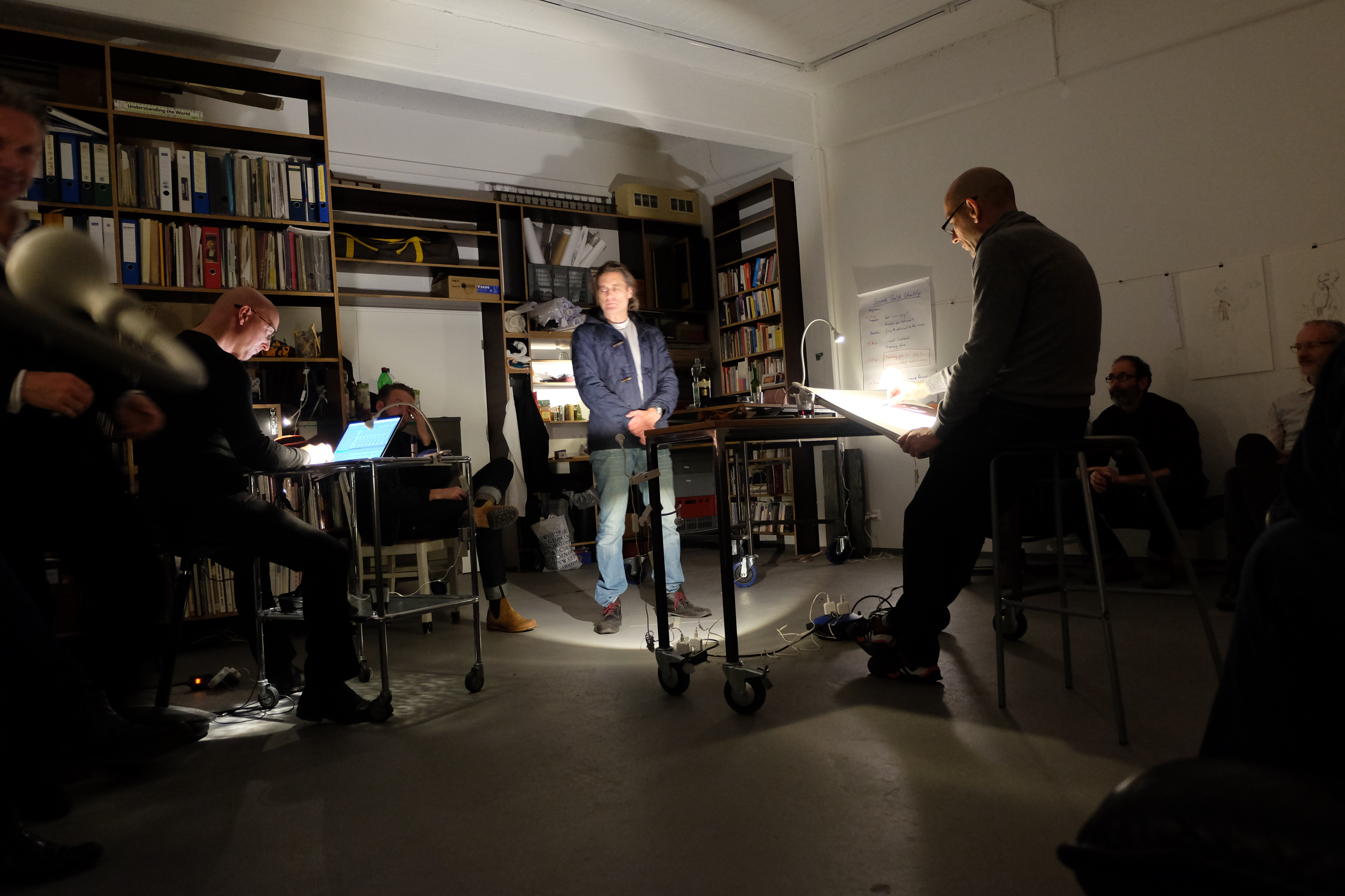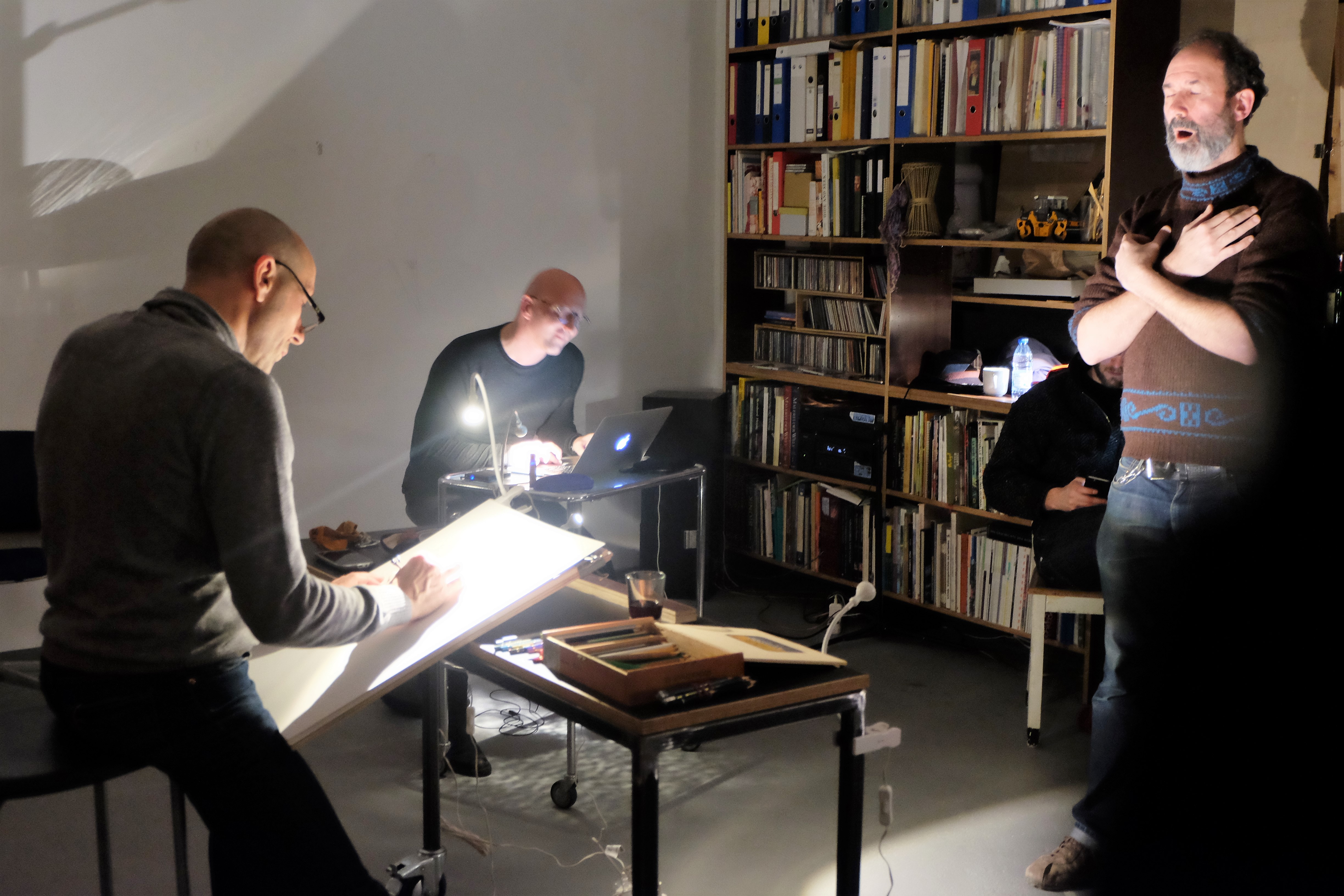 The Portray Society is a performative process involving the Artists (sound and visual) and a limited amount of Guests in a room, with the task to sonically and visually sketch potraits of the so gathered community.